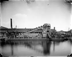 A bucket dredger is equipped with a bucket dredge, which is a device that picks up sediment by mechanical means, often with many circulating buckets attached to a wheel or chain.[18]