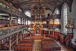The interior of the church is entirely from the time of its construction. The ceiling paintings are based on medieval forms of representation. They are all conceived like panel paintings. There is evidence that 20 scenes date back to the picture bible of Matthew Merian. The illustrations of the church scenes serve the understanding and the spreading of the word of God, completely in the sense of the Lutheran faith. In contrast to the usual Baroque ceiling paintings, the paintings are not aligned with a line of sight.[10]