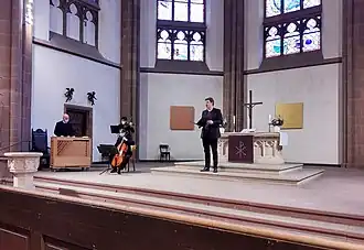 After World War II, church music became a focus at the Dreikönigskirche, with Kurt Thomas as the church musician (Kantor) from 1945 to 1957,[9] and Helmut Walcha as the organist from 1946 to 1981.[5] Thomas founded an a cappella choir at the church, first called Chor der Dreikönigskirche, then Frankfurter Kantorei, which received international recognition.[10][11] The choir performed the world premiere of Kurt Hessenberg's St Luke Passion at the Dreikönigskirche in 1978, initiated and conducted by Helmuth Rilling, also many Bach cantatas and compositions by Thomas.[12] The church was a leading venue of major church concerts in Frankfurt until the opening of the Alte Oper as a concert hall in 1981.[5]