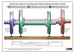 - ^ Gladstone station, South Australia, 1976. The four rails in the foreground include one rail that is common to all three gauges (the rail on the right) and the gauges are as follows (numbering rails from left to right): broad gauge, 1 and 4; standard gauge, 2 and 4; narrow gauge, 3 and 4.