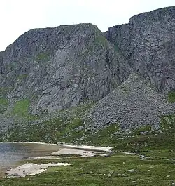 A granite wall, Creag an Dubh Loch, rises steeply above the loch on the southeast shading the loch from the sun – hence the name "dark lake". Creag an Dubh Loch is about 1.5 kilometres (0.9 mi) long and generally about 200 metres (660 ft) high – at its highest it is 270 metres (890 ft) making it the highest continuous rock face in the Cairngorms.[3]