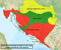 Some of the findings "are a characteristic of Croatian production".[50] Since the mid-9th century flourished a distinctive Croatian-type production of jewellery (most notable being large bead shaped earrings with "no contemporary European parallel", while statistically by order earrings, pendants, rings, buttons, necklaces).[70] The workshops probably were located in Solin and Knin in Dalmatia,[71] and Sisak in the continental part.[72] Archaeologists recognize and distinguish two cultural variants of the "Old-Croatian" archaeological period (7/9th-11th century[73]), a proper Old-Croatian or Croatian-Dalmatian/Littoral culture, and Pannonian-Bijelo Brdo culture (since mid-10th century[74]),[75][76] which were contemporary to Carinthian-Köttlach culture in the west.[77][78] Findings of the Croatian-Dalmatian variant were found from Istria down to Dubrovnik, in the hinterland near rivers Neretva, Vrbas and Bosna and into southwestern Pannonia, while the second variant was mostly present between Sava–Drava region in Croatia and in northern Bosnia and Herzegovina with some findings in Adriatic coast and hinterland.[79][80] The archaeological findings of Croatian-Dalmatian culture in Lower Pannonia and northwestern Bosnia and Herzegovina, as well in Istria and eastern parts of Bosnia and Herzegovina, can be attributed to influence and trade, but also expansion of the early medieval Croatia.[81]