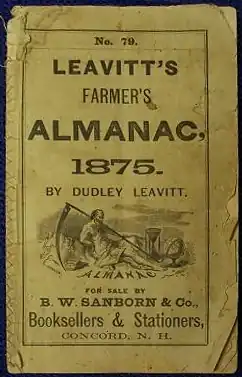 Dudley Leavitt (1772 – September 20, 1851) was an American publisher. He was an early graduate of Phillips Exeter Academy[1] in his native town of Exeter, New Hampshire, and later moved to Gilmanton where he first edited a newspaper and taught school. Within a few years, Leavitt relocated to Meredith, where in addition to teaching school and farming, he began publishing in 1797 Leavitt's Farmers Almanack, one of the nation's earliest farmers' almanacs.[2] A polymath, Leavitt poured his knowledge of disparate fields including mathematics, language and astronomy into the wildly popular almanacs, which outlived their creator, being published until 1896. The inaugural issue of 1797 carried the title of The New England Calendar: Or, Almanack for the Year of Our Lord 1797. On the cover was the disclaimer that the new publication was "Calculated for the Meridian of Concord, Latitude 43° 14' N. Longitude 72° 45' W.: And with But Little Variation Will Answer for Any of the New England States."[3]
