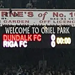 Oriel Park hadn't seen European football since 1991 and, as things were, the ground didn't meet UEFA's requirements for hosting games were the club to reach Europe again. So, after qualifying for the Europa League qualifying rounds in 2010, a concerted effort was made to ensure the matches would be played in Oriel – the 'BE-TOP' (Bring Europe to Oriel Park) campaign.[34] The first European match in the town of Dundalk for nearly 19-years saw Dundalk defeat Grevenmacher and make it through to the second qualifying round.[35] Levski Sofia were next, and the gulf in standard was reflected in the 8–0 aggregate defeat.[36]