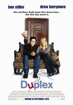Duplex (released in the United Kingdom and Ireland as Our House) is a 2003 American black comedy film directed by Danny DeVito (who also narrated the film) and written by Larry Doyle. The film stars Ben Stiller and Drew Barrymore with Eileen Essell, Harvey Fierstein, Robert Wisdom, Justin Theroux and James Remar in supporting roles.[2]