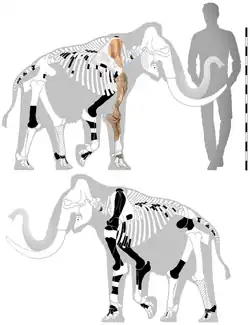 During the late Middle Pleistocene to Late Pleistocene around 330,000-24,000 years ago, the Japanese archipelago was inhabited by the elephant species Palaeoloxodon naumanni.[46] This species was only modestly dwarfed compared to its large continental ancestor,[47] having a reconstructed shoulder height of 2.4–2.8 metres (7.9–9.2 ft), for males and around 2 metres (6.6 ft) for females.[46]