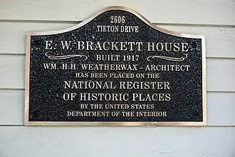 The E. William Brackett House, located in Yakima, Washington, was listed in the National Register of Historic Places in 1990.[2] Originally located on 80 acres (32 ha) of orchards and farmland, the building is currently on a three-quarter acre lot, the remainder of the property having been subdivided mostly for single family homes. The interior is composed of 6,000 sq ft (560 m2) of living space symmetrically arranged around a central entry hall.