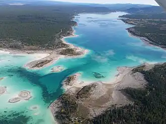 Eagle Lake (officially named Lhuy Nachasgwen Gunlin)[1][2] is an endorheic lake in the western Chilcotin District of the Central Interior of British Columbia, Canada, located southeast of Tatla Lake and west of the city of Williams Lake.[3] On 11 June 2020 the name of the lake was officially changed to its traditional Tŝilhqot'in name, Lhuy Nachasgwen Gunlin, which means "where there are many small fish."[4][5][6] The lake is a popular summer location with warm water, sky-blue water, and white sand beaches. The lake has no outflow, and the water level continues to recede over time. Since 1970, the lake level has dropped over 6m (as of 2018). This means that the former Islands are now connected to the shoreline and new Islands have been created on the western bay.