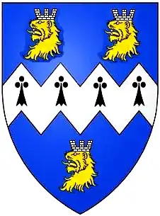 Arms of Fellowes of Eggesford, Devon: Azure, a fesse indented ermine between three lion's heads erased or murally crowned argent. Newton Wallop, later 4th Earl, adopted these arms by royal licence in 1794 together with the surname Fellows on inheriting the manor of Eggesford. The 5th Earl reverted to the ancient Wallop arms and name, but without royal licence[1]