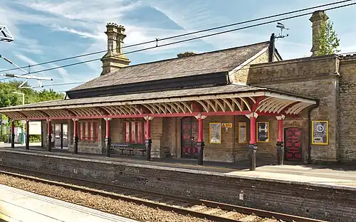 The waiting room on the Liverpool-bound platform is the oldest station building in the world still in passenger service, although this is now limited to providing shelter from the rain under its canopy.[3] The building is currently derelict, with tickets being sold in a more recent structure on the opposite side of the line.