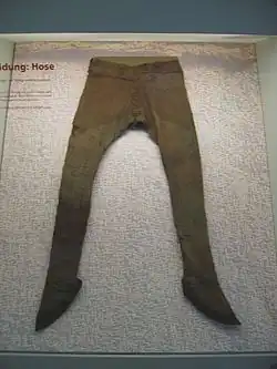 The primary garment was the tunic — generally a long fabric panel, folded over with a neck-hole cut into the fold, and sleeves attached. It was typical for the wealthy to display their affluence with a longer tunic made of finer and more colorful cloth, even silk or silk-trimmed. The tunic was usually belted, with either a leather or strong fabric belt. Depending on climate, trousers were tailored either loose or tight (or not worn at all if the weather was warm). The most basic leggings were strips of cloth wound round the leg, and held in place by long laces, presumably of leather, which is called cross-gartering. This may have been done with loose-fitting trousers also. Tighter-fitting hose were also worn.