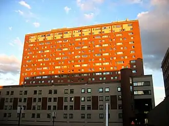 East Campus is a prominent building on the Morningside Heights campus of Columbia University in New York City, located along Morningside Drive between 117th and 118th Streets. One of the tallest buildings in the neighborhood, it serves primarily as a residence hall for Columbia undergraduates, although it also contains the university's Center for Career Education, its Facilities Management office, and the Heyman Center for the Humanities.[1] East Campus, a $28.7 million facility, was designed by Gwathmey Siegel & Associates Architects and built in 1979-1982.