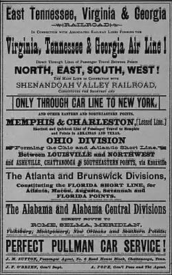 While efforts to establish a railroad in East Tennessee began in the 1830s, financial difficulties stalled construction until the late 1840s. The East Tennessee and Georgia Railroad was built between 1847 and 1859, connecting Knoxville, Tennessee, with Dalton, Georgia.[3] The East Tennessee and Virginia Railroad was built between 1850 and 1856, connecting Knoxville with Bristol, Virginia.[3] Knoxville financier Charles McClung McGhee formed a syndicate which purchased both lines to form the ETV&G in 1869, and largely through McGhee's efforts, the new ETV&G bought out numerous other rail lines across the region.[2] By 1890, the ETV&G controlled over 2,500 miles (4,000 km) of tracks in five states.[4]