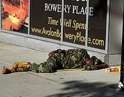 307. ^ Moynihan, Colin (February 27, 2000). "NEIGHBORHOOD REPORT: EAST VILLAGE; A Threat Shadows a Relic From a Grim Era". The New York Times. Retrieved February 25, 2024. For nearly two decades, a 60-by-100-foot mural depicting a ravaged-looking man wearing a crucifix earring and a bandanna and smoking a cigarette has loomed over St. Marks Place between Second and Third Avenues. The man in the mural, John Spacely, a heroin addict and a regular presence on the block, was the subject of a 1984 documentary-style film called Gringo.