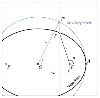 For a point on the ellipse, P = P(x, y), representing the position of an orbiting body in an elliptical orbit, the eccentric anomaly is the angle E in the figure. The eccentric anomaly E is one of the angles of a right triangle with one vertex at the center of the ellipse, its adjacent side lying on the major axis, having hypotenuse a (equal to the semi-major axis of the ellipse), and opposite side (perpendicular to the major axis and touching the point P′ on the auxiliary circle of radius a) that passes through the point P. The eccentric anomaly is measured in the same direction as the true anomaly, shown in the figure as . The eccentric anomaly E in terms of these coordinates is given by:[1]