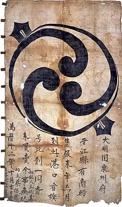 Wadōkaichin (和同開珎) is the oldest official Japanese coinage, having been minted starting on 29 August 708[40] on order of Empress Genmei.[41][42][43] Inspired by the Chinese Tang dynasty coinage Kaiyuan Tongbao, the Wadōkaichin began being produced following the discovery of large copper deposits in Japan during the early 8th century.[44][45]