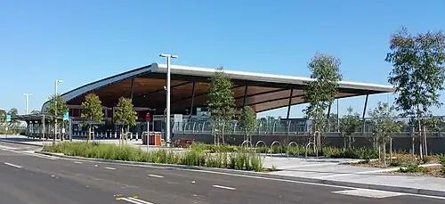 Edmondson Park opened on 8 February 2015.[3][4] It has one island platform with two faces.[5] Initial services consisted of a half-hourly shuttle between Leppington and Liverpool.[6] From 13 December 2015, trains operate directly to the city via Granville.[7] From 26 November 2017, Cumberland Line services stop at the station, providing a link to Parramatta, Blacktown, Schofields and Richmond.[8][9]