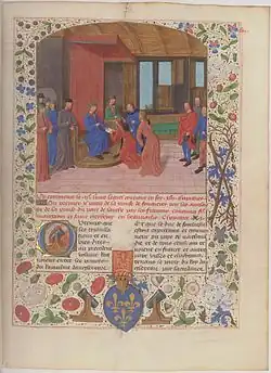 ![]() Edmund Beaufort (left) negotiating with French envoys at Rouen, miniature from Bibliotheque Nationale de France, MS Fr. 2691, a copy of the Chronique of Jean Chartier, c. 1470–80, probably decorated by Philippe de Mazerolles. | |