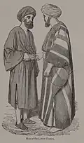 The topmost layer was a square cloak called and abayeh or aba. It was often made of wool, and sometimes black, but blue and white and brown and white stripe were also common in the 1830s.[23] Brighter colors such as purple or blue, with metal thread decoration, are also found in some extant 19th-century examples.[27] A cloak like the aba, but fuller, also existed. It was called a diffeeyeh and usually black or blue in color. Some middle-class men also might wear a black cotton gown over their clothes to avoid appearing wealthy.[23]
