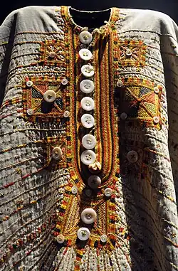 One of the outer garments was the aforementioned tob, thob, sebleh, or tob sebleh, which was a large, loose caftan with very wide sleeves, usually in a black or blue color. A poor woman's might be made of cotton. A wealthier woman's could be cotton with silk stripes, taffeta, or watered silk.[24] Sometimes the wealthy woman's tobs were rose, pink, or violet in color, but a poor woman's was typically blue.[26] Mantles such as the melaya leff were also worn, as were face veils,[22] and the tarha, a scarf worn over the head and down the back. The tarha was of embroidered white muslin, colored crepe with gold embroidery and spangles, or dark blue cotton or linen for poor women. The face veil was black or deep blue, and sometimes decorated with gold or silver pieces, false pearls, coral, and chain tassels.[26]