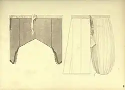 The drawers of an Egyptian man of the 1830s were called libas. They were made of cotton or linen, and had an embroided dikkeh/tikkeh (drawstring). The drawers were typically knee or ankle length, with some religious men preferring the former due to a prohibition on the latter attributed to Mohammed.[23]