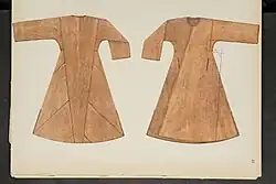 One popular garment was the qaba, which came in two main varieties; the Turkish style (al-aqbiya al-turkiyya), and the Tatar (or Mongolian) style (al-aqbiya al-tatariyya or qabā' tatarī). The latter fastened on the wearer's right side, and was preferred by Mamluk amirs in its day over the former style, which was favored by the Seljuks and Ayyubids. Both varieties had a waist seam and sometimes had a pleated or gathered skirt, and fastened with buttons or strings. It was typically knee or calf length.[13] The Qaba likely belongs to a garment family which stems from the Mongolian terlig and includes the jama and tieli.[15] It is also possibly of Turkic origin.[16] Open coats also existed and were layered over other coats and robes.[13]