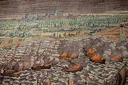 In November, Fadrique started the Siege of Leiden. The first stage of the siege ended in March 1574, when the Spanish troops had to deal with a mercenary force led by Orange's brothers Louis and Henry of Nassau-Dillenburg.[34] They engaged the Spanish troops at Mookerheyde, which ended in a clear Spanish victory.[34] The second stage of the siege of Leiden started in May. The polders surrounding Leiden were flooded and a Sea Beggar fleet managed to lift the siege on 2 October 1572.[35][note 3]