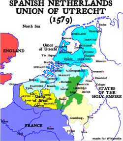 The Netherlands in 1579, indicating the Unions of Utrecht (blue) and Atrecht (yellow)