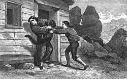 An engraving showing a cat springing at a vicar's neck as denoted in an Icelandic legend.