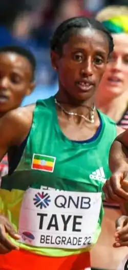 She won the bronze medal in the 3000 metres at the 2022 World Indoor Championships in Belgrade with a time of 8:42.23. Her compatriot Lemlem Hailu took gold in 8:41.82 while second-placed Elle Purrier St. Pierre clocked 8:42.04.[7] Taye ran 14:21 at the Cursa dels Nassos 5K on New Year's Eve trying to improve her own world record, the second-fastest mark in history.[8]