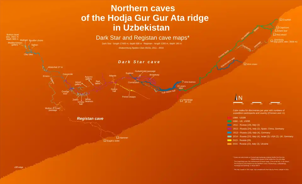 Surprisingly the lakes in the cave were still frozen and cavers were able to resume exploration where the Brits stopped in 1990. 1500 m of new large tunnels were discovered, a new entrance, Vino rosso, the cave also connected to Iževskaja, which enabled easier access to deeper parts of Dark Star. The cave now had 6 entrances and its depth reached 300 m. The third team, tasked with explorations in Festival'naja cave, found out that the bottom of the cave is without continuation, but they found a higher continuation in "Salavat universe", which yielded 2 km of new tunnels, including a very large hall "Everest". The survey showed that the connection to other caves of the Southern group, Jubilejnaja, Berloga, and Učitel'skaja caves was within reach.[25][31] In 2012 SGS, with the support of the Association of Cavers of the Urals, launched the largest expedition so far, with 29 participants from Russia, Italy, Spain, China, and Germany of which 10 were girls, very skillful in cave survey. They worked in 3 caves: Ulugh Beg, Festival'naja, and Dark Star. In the first one cavers needed 3 days to break through the ice-blocked tunnel but discovered new parts which ended in the mountain wall, with a new, easier cave entrance. On the plateau on the ridge, several caves were found which ended with impassable narrows. In Festival'naja cave 2 km of new tunnels were found, 1 km of which was also surveyed, and a surface survey was made which connected the cave entrance to entrances of Jubilejnaja and Berloga. In the Dark Star normal route was again impassable, lakes were full of a slurry of water and ice. The connection to Iževskaja cave, discovered in 2011, made the access possible. The team made important new discoveries, cave depth increased to 600 m, there were 6 km of new tunnels surveyed, several possible continuations remained. Samples were also taken and sensors were installed to help determine the paleoclimate of the area.[25][32][33][34] An expedition result rarely surpassed in deep cave exploration.[35] In 2013 a Russian-Italian-German team of 21 managed to substantially deepen the cave, to the level around 900 meters below the top entrance. They also discovered around 40 m high waterfall at a depth of 750 m.[36][37] Previous achievements attracted the largest ever SGS expedition to Hodja-Gur-Gur-Ata in 2014, of 31 people from 6 countries which included a National Geographic photo team.[38][2] A team of 4 set up camp on the ridge plateau, at an altitude of 3700 m. They surveyed a surface trek from above the Red dwarf entrance to the bottom of Dark Star. The elevation difference between the cave tunnels and the surface gradually increased from 150 m to 250 m. There were no visible tectonic faults along the way, above the cave bottom there was a small canyon on the surface, which ran in the direction of a lake, situated at an altitude of 2400 m. This fact would reduce the cave depth potential from 2100 m to 1100 m. The team also inspected the terrain from the cave area to the group of canyons close to the top of the mountain at an altitude of 3921 m. No potential cave entrances were found. They also checked the cave R-20 which closed soon. The Dark Star team examined the bottom of the cave, at a depth of 900 m, and concluded that the karst rock strata (limestone) came into contact with poorly soluble and non-karst strata such as shale and sandstone. Any advancement to greater depths would require extensive digging. The team discovered many new tunnels, of considerable length, following several small water flows in the upstream direction.[38][39] In 2015 an SGS and ASU expedition of 26 was divided into three teams, the largest, 14 cavers, departed to Dark Star cave and the other two to Boybuloq cave, water springs below its terminal siphon and to the plateau above the cave. At the Dark Star bottom, the team tried to push through boulder chokes and previously impassable meander tights. To no avail, any reasonable effort to get through would have to involve large-scale mining. There was progress in the higher levels of the cave, new tunnels decreased the distance from the nearest cave of the Southern group (Isetskaja) to 800 m.[40][41][42] In 2016 the 26-strong Russian-Italian-Ukrainian expedition worked mainly in Chul-Bair. One team however departed to Hodja-Gur-Gur-Ata ridge to try to connect the Northern and Southern caves through Isetskaja cave, to check possible new cave entrances in the mountain wall, and to advance in the upper levels of the cave. In Isetskaja cave a meander, leading to the closest Northern group cave, Iževskaja, was discovered. Soon after its beginning, the meander turned away, towards the inside of the mountain. Through the entrance R-20, which is not far from Iževskaja cave entrance, cavers advanced 1300 m far and 190 m deep into the mountain, to 100 m of the nearest point in Dark Star. They renamed the cave to Registan. Progress was also made in the Dark Star, in the Forest steppe tunnel.[43] Further work on Hodja-Gur-Gur-Ata was put on hold, all the efforts were directed to the Višnevskij cave.