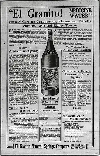 During the Spanish–Mexican area of California history, a settler used the spring water for curing olives.[1] The spring was first commercialized around 1876.[2] In the early 20th century El Granito water was bottled and marketed to the public.[3]