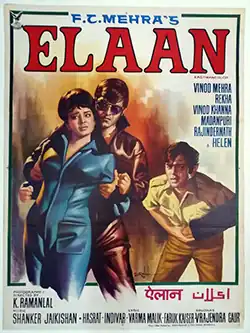 Elaan is a 1971 Bollywood Sci-Fi thriller film directed by K. Ramanlal.[1] The film stars Vinod Mehra, Rekha, Vinod Khanna, and Madan Puri.[2] The rights to this film are owned by Shah Rukh Khan's Red Chillies Entertainment.