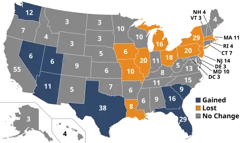 The following is a summary of the electoral vote changes between United States presidential elections. It summarizes the changes in the Electoral College vote by comparing United States presidential election results for a given year with those from the immediate preceding election. It tracks those states which changed their support between parties as well as changes resulting from other factors, such as reapportionment.[1][2]