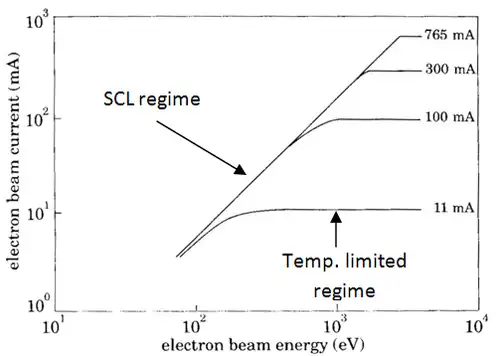 In any application where electrons are emitted across a vacuum gap, there is a maximum allowable current for a given bias due to the self repulsion of the electron beam. This classical 1-D space charge limit (SCL) is derived for charged particles of zero initial energy, and is termed the Child-Langmuir Law.[32][33][34] This limit depends on the emission surface area, the potential difference across the plasma gap and the distance of that gap. Further discussion of this topic can be found.[35][36][37][38]