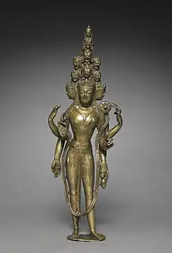 The Thousand-armed Avalokiteśvara with eleven heads is the most popular form. The number of heads increases to twenty five, and sometimes the crown bears upto five hundred heads.[12]