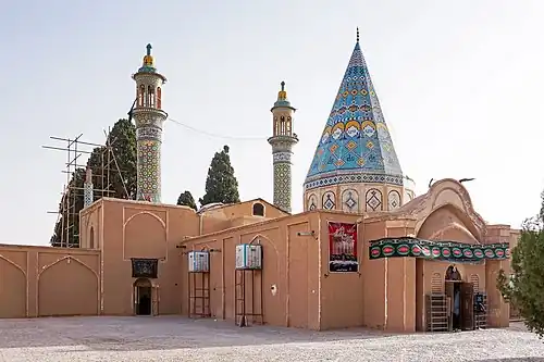 The Emamzadeh Ebrahim (Persian: امامزاده ابراهیم; Arabic: مرقد إبراهيم) is a Shi'ite funerary monument and religious complex, located in Kashan, in the province of Isfahan, Iran. The emamzadeh was completed in 1895 CE, during the Qajar era, and is renown for its turquoise dome, tiled minarets, pleasant sahn and beautiful iwan. Paintings, tiles and decorations with cut mirrors have been added later in the early 20th century.[1]