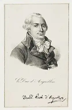 Emmanuel Armand de Vignerot du Plessis, Duke of Aiguillon (French pronunciation: [emanɥɛl aʁmɑ̃ viɲʁo dy plɛsi]; 31 July 1720 – 1 September 1788), was a French soldier and statesman, and a nephew of Armand de Vignerot du Plessis, 3rd Duke of Richelieu. He served as the Secretary of State for Foreign Affairs under King Louis XV.