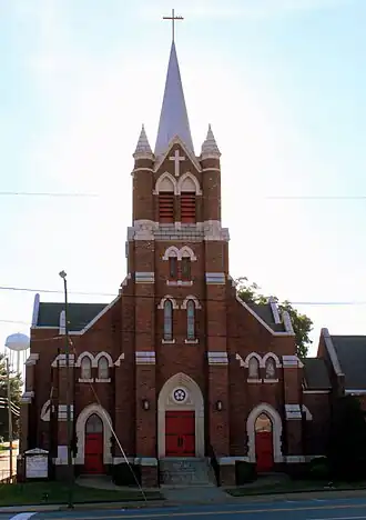 Emmanuel Lutheran Church is a historic Lutheran church building located at 216 S. Aspen Street in Lincolnton, Lincoln County, North Carolina. It was built in 1919, and is a rectangular Late Gothic Revival-style brick church with a four-stage central tower with a conical steeple. It features pale beige terra cotta, cast stone, granite, and poured cement detailing; lancet arched door and window openings; and stepped buttresses.[2]