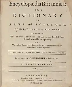 The Britannica was first published in serial installments between December 1768 and about August 1771 in Edinburgh as the Encyclopædia Britannica, or, A Dictionary of Arts and Sciences, compiled upon a New Plan.[14] The new plan in question was an organizational one, namely to include two kinds of typographically distinct entries (articles and longer "treatises") in a single alphabetical sequence. In principle, "treatises" were to cover the arts and sciences, leaving articles to deal with their subordinate objects. The idea may have been inspired by Dennis de Coetlogon's Universal History of Arts and Sciences, an alphabetical encyclopedia that contained only treatises.[15] Regardless, the Britannica continued to intermix formally distinguished articles and treatises through the 10th edition.[16]