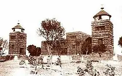 In his account of the visit to Eritrea in 1891 by a Royal Commission sent by the Italian government, Ferdinando Martini, in line with his derogatory attitude towards all matters concerning the native "Abyssinians", described the then church at Asmara as less decent than the huts for hay in Italian farmyards.[10] The illustrated fourth (1896) edition of his book includes a photograph of the church,[11] some seven metres long, with traditional "monkey head" walls and a thatched roof whose projection beyond the walls was supported by rough poles.