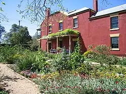 Most plant varieties chosen have been known to exist in Australian gardens prior to 1850. The lack of grassed areas reflects the fact that "cottage beds" were easier to maintain than lawns. Areas are connected with gravel, stone or brick paths. An eccentric orchard under-planted with white evening primrose, alyssum and bulbs forms a second section. The orchard is bisected by a winding gravel path where azaleas grow. The left side of the orchard provides more circular forms and incorporates a stone folly to mark the ruin of a former stable and loft known to have existed at this position. The statue is placed at the intersection of various axes including those from the stair light window and back door. A third section is a drying court and kitchen garden (currently a herb garden and strawberry patch), which leads through the hedge to a formal parterre cottage garden with sundial centrepiece. The hedge is African olive (Olea europaea var.africana), a common form of colonial hedging. The seedlings were collected from surrounding paddocks and planted in 1989. The hedged parterre is being converted from self-seeding annuals to a rose garden of older European varieties (15th to 19th centuries), grown on their own roots (where available) and under-planted with hardy perennials.[2][1]
