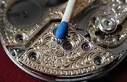 Engravers use a hardened steel tool called a burin, or graver, to cut the design into the surface, most traditionally a copper plate.[3] However, modern hand engraving artists use burins or gravers to cut a variety of metals such as silver, nickel, steel, brass, gold, and titanium, in applications ranging from weaponry to jewellery to motorcycles to found objects. Modern professional engravers can engrave with a resolution of up to 40 lines per mm in high grade work creating game scenes and scrollwork. Dies used in mass production of molded parts are sometimes hand engraved to add special touches or certain information such as part numbers.