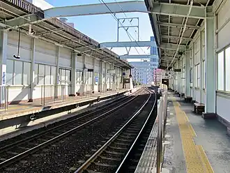 The station has dual opposed elevated side platforms, with the station building located underneath. It is staffed during daylight hours. The station building has automated ticket machines, and automated turnstiles which accept the NicePass smart card, as well as ET Card, a magnetic card ticketing system.
