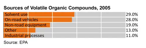 Products that are packaged in aerosol cans contain a chemical known as propellant gas.[5] Almost always, this propellant gas is called chlorofluorocarbons (CFCs).[5] CFCs have been proven to damage the ozone layer and caused the ozone hole. Thus, in 1996, CFCs were banned directly as a result of the detrimental environmental impacts.[6] This ban came as a result of The Montreal Protocol of 1989, which called for action to reduce and eliminate ozone-depleting substances.[7] Following the ban of CFCs, aerosols are now filled with hydrocarbon or compressed gasses, which have been linked to cause VOCs, which are associated with smog and air pollution.[6]