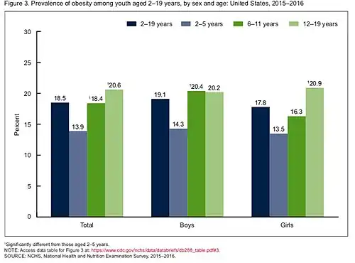 According to the CDC, For the 2015–2016 year, the CDC found that the prevalence of obesity for children aged 2–19 years old, in the U.S., was 18.5%.[7] The current trends show that children aged 12–19 years old, have obesity levels 2.2% higher than children 6–11 years old (20.6% vs. 18.4%), and children 6–11 years old have obesity levels 4.5% higher than children aged 2–5 years old (18.4% vs. 13.9%). Boys, 6–19 years old, have a 6.1% higher prevalence of obesity, than boys aged 2–5 years old (20.4% vs. 14.3%). While girls aged 12–19 years old, have a 7.4% greater prevalence of obesity, than girls aged 2–5 years old (20.9% vs. 13.5%).[7]