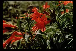 At the end of each erect branch is a glandular inflorescence bearing a bright red-orange tubular flower 2 or 3 centimeters long. A bunch of stamens and one long pistil protrude obviously from the mouth of the bloom, which is pollinated by nectar-feeding birds. The fruit is a hairy capsule about two centimeters long.