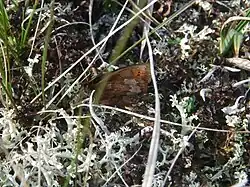 debanensis Ersch. (37 f). Upperside dark black-brown, on the forewing a straight submarginal row of 4 round small black spots bearing black dots; before the margin of the hindwing there are as a rule 3, but rarely 4, such red-brown spots, which are only very minutely or not at all dotted with black. The underside of the forewing grey-brown, with an obsolescent russet brown distal band, the ocelli of which have a somewhat lighter border. The apex and distal margin thinly dusted with white-grey. The underside of the hindwing is somewhat more densely scaled white-grey and has a but little darker dentate median band which is sharply defined in- and outwardly and bordered by a narrow whitish dentate line here and there on both sides. The ocelli which are situated in the somewhat lighter distal area are smaller than above, being sometimes altogether absent or replaced by small, hardly visible, black dots. Before the outer margin there is a submarginal band composed of small obsolescent brown spots. The female is lighter, more grey-brown, the ocelli of the hindwing are distinctly larger and on the underside of the hindwing of the same size as above. From East Siberia. — tundra Stgr. [now full species Erebia tundra Staudinger, 1888] is smaller, the distal band of the upperside somewhat obsolescent, beneath broader and proxinially and distally sharply defined. The underside of the hindwing scaled white-grey, with dark brown, distally dentate, median band and before the distal margin a slightly dentate dark transverse line. Likewise from East Siberia. — fletcheri Elw. [now full species Erebia fletcheri ] of which is known only the figure of the single sure female captured by Fletcher at 7500 ft. in the Altai Mts., is apparently nothing but a specimen of debanensis in which the reddish yellow borders of the ocelli of the forewing are merged on both sides to form a broad russet band. On the hindwing the small ocelli are widely separated from one another. The median band on the underside of the hindwing is dark and somewhat prominent in debanensis , while in fletcheri it is of the same dark brown colour as the rest of the wing, so that only the edges of this band are visible as two finely dentate black curved lines. Found in July between Kurai and Bashkaus.[2]
