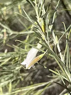 Eremophila dalyana is a shrub or small tree which grows to a height of between 1 and 4 m (3 and 10 ft) and a width of up to 1.5 m (5 ft). It has many erect branches giving the plant a broom-like appearance. Most parts of the plant are covered with silvery or greyish scales. The leaves are erect, arranged in opposite pairs, linear in shape, mostly 13–50 mm (0.5–2 in) long, about 1 mm (0.04 in) wide and have a curved hook on the end.[2][3][4]