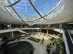 Erin Mills Town Centre was built on a land that had been accumulated by E. P. Taylor's "Don Mills Developments" in 1954.[2] The mall opened in 1989 and was owned and managed by Cadillac Fairview until it was purchased by the Ontario Pension Board in 2010 for $370 million (CAD).[3] Excavation for the mall was started in 1987, and completed in 1989. There was a large clock tower at the centre of the mall, though this was replaced with a glass sphere during the (CAD) $100 million redevelopment.[4] A Cineplex Odeon movie theatre was closed in 2000 and was replaced by Old Navy and Sport Chek stores. In addition, there was a daycare which was converted to retail space in 2005. The mall also had a mini-golf course located in the centre court, but it was converted into an upscale café. In 2008, a plaza outside the mall, but on the mall grounds was built. The plaza consisted of Indigo Books, LCBO, and more. There was also an older plaza located on mall grounds (which was previously a Loblaws grocery store opened in 1992) which consisted of Dollarama, HomeSense, Menchies, and also a salon.[5]